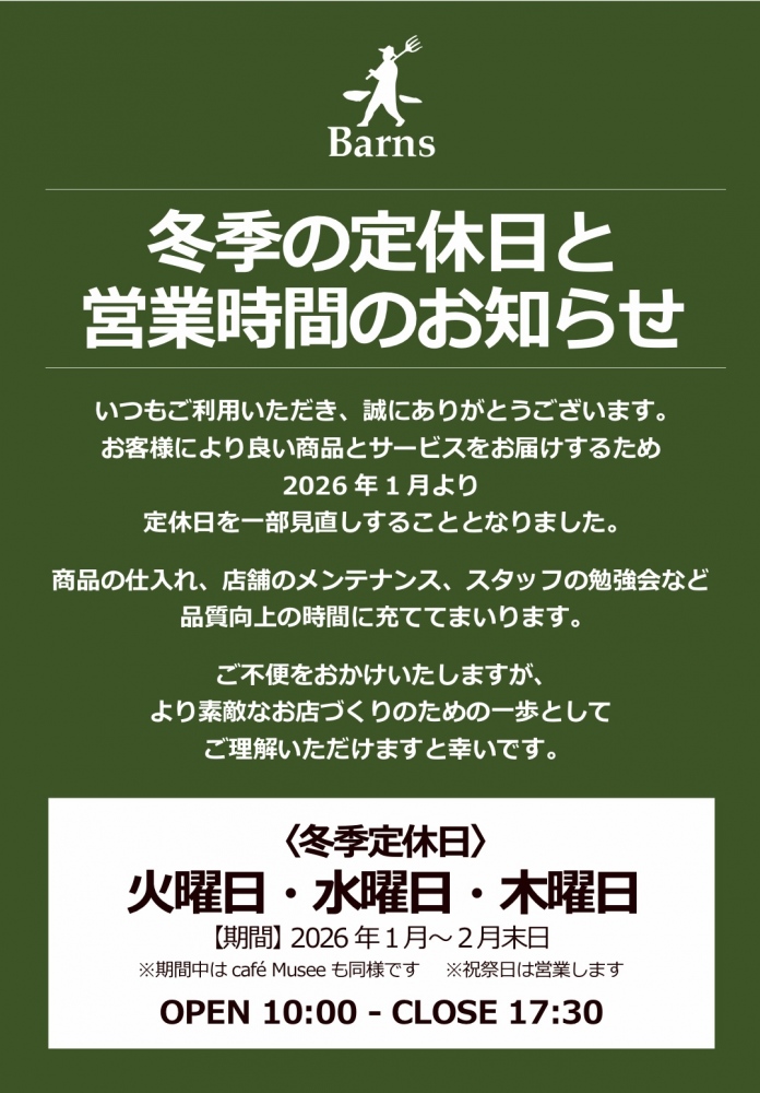 お客様により良い商品とサービスをお届けするため、2026年1月より定休日を一部見直しする事となりました。