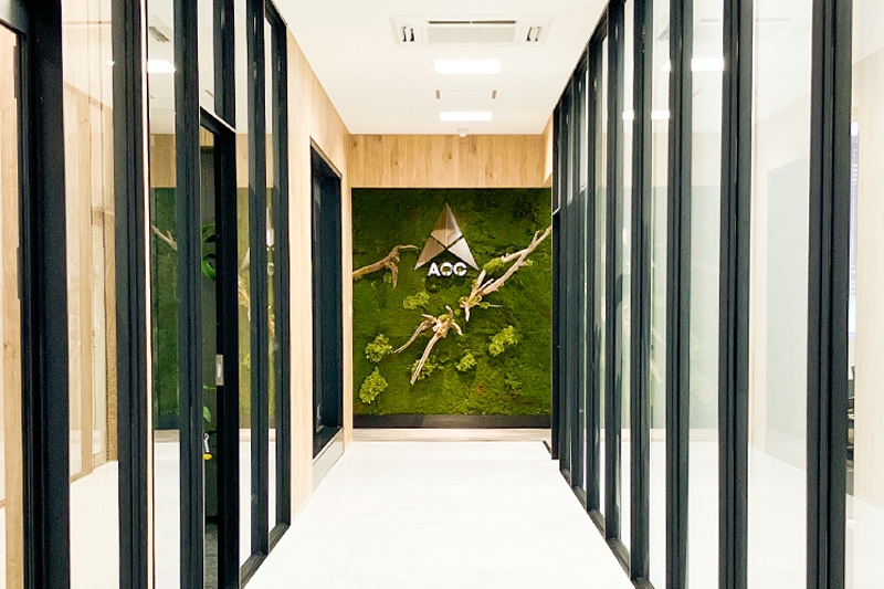 自然風・自然光が入りやすい日本家屋をイメージした建物内には、和テイストに合う観葉植物を選んで配置しています。バイオフィリックデザインを取り入れ、環境配慮と働きやすさの両立を目指した次世代オフィスです。